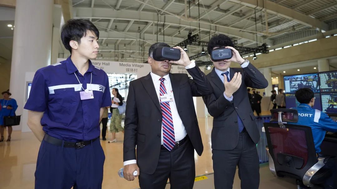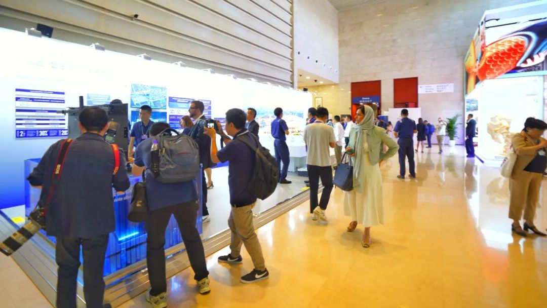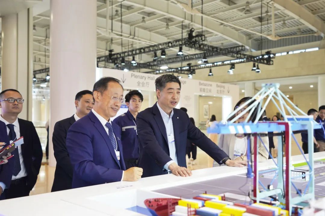 在天津科技展示区,天津港全球首个“智慧零碳”码头的全景式互动沙盘吸引了来自世界各地嘉宾驻足关注。这个码头岸线总长1100米,占地面积75万平方米,拥有3个20万吨级的泊位,拥有12台单小车岸桥、42台轨道桥、92台智能水平运输机器人(ART)。这些元素全部“浓缩”在一起:沙盘上“岸桥”在船边移动,“场桥”在堆场往来,风电设备稳定运行……这座“建设周期最短、智慧程度最优、运营成本最低、装卸效率最高、绿色低碳最佳、适用范围最广、颜值色彩最美”的“智慧零碳”码头,向世界展示着天津港世界一流绿色智慧枢纽港口建设的生动成果。