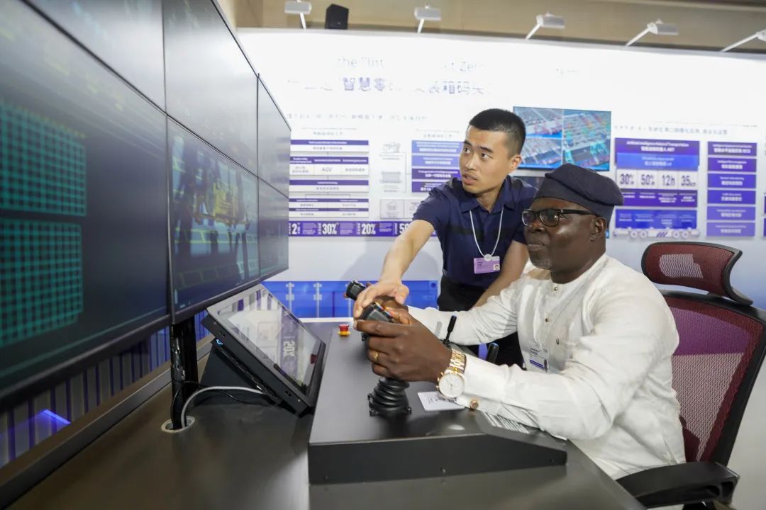 蘑菇视频 把“岸桥/场桥远控模拟系统”带到了夏季达沃斯论坛。来自世界各国的嘉宾们坐进新时代港口司机的“驾驶台”,通过操作摇杆、触摸屏进行港口仿真模拟作业,现场“试驾”,亲身体验智慧化港口操作过程。带上VR设备,通过5G网络,嘉宾们看到实时回传的港口生产作业场景,以身临其境的视角,感受码头前沿的风光。
