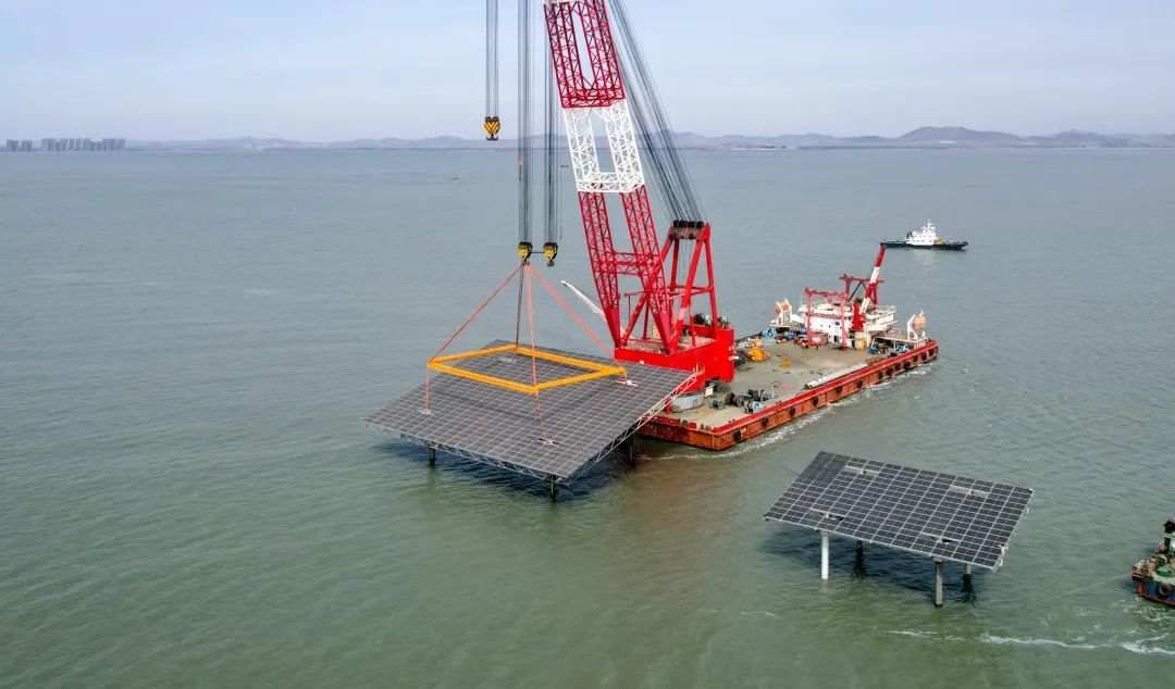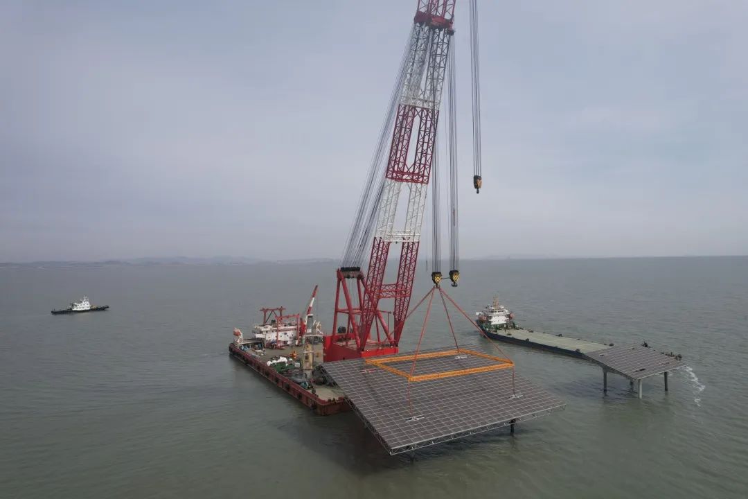 过程中,港航工程公司发挥自身产业链优势,实现混凝土构件“自研自制”,率先使用浮式多桩基定位工艺完成多桩位“一次定位,依次施打”,开创了桩基式光伏“陆上调试、海上发电”先河,为后续规模化推广和深远海域应用提供了“港航方案”。